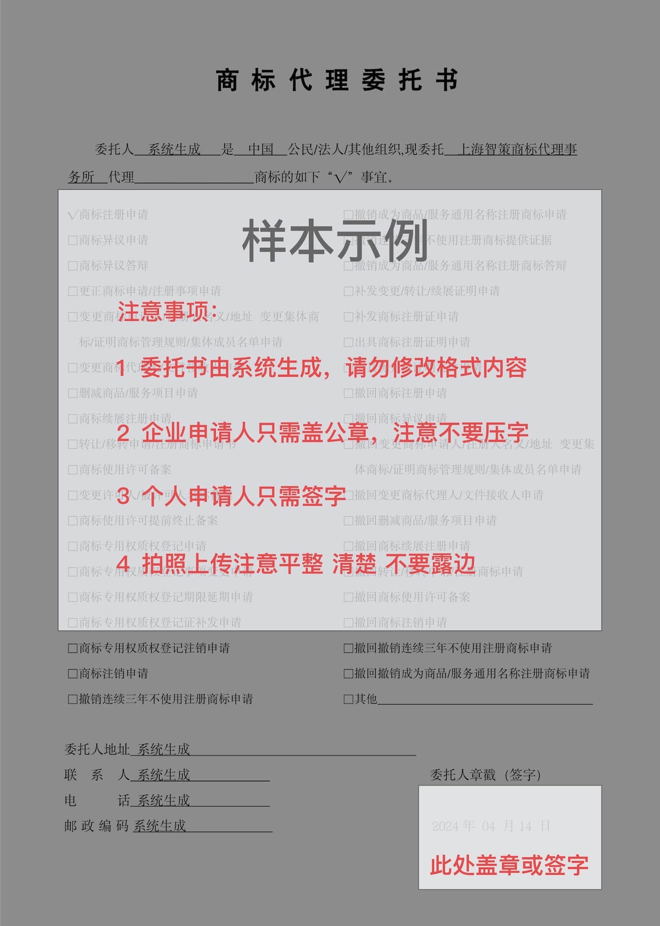 注:委托书已经自动生成。请下载并打印,以自然人名义申请的需黑笔签名,以企业名义申请的需盖公章后,扫描彩色件并上传。Jpg格式,小于2M,宽高要求:600px-4000px。